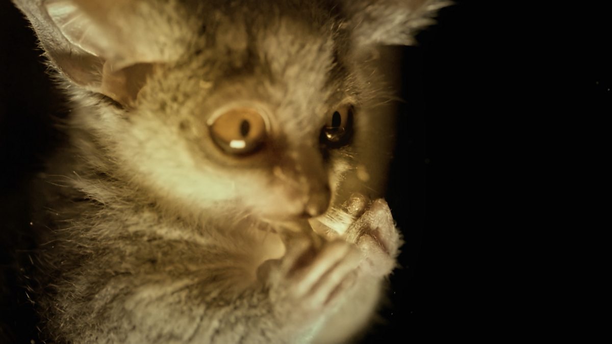 A hungry bushbaby in South Africa is drawn towards an eery light and a bounty of food