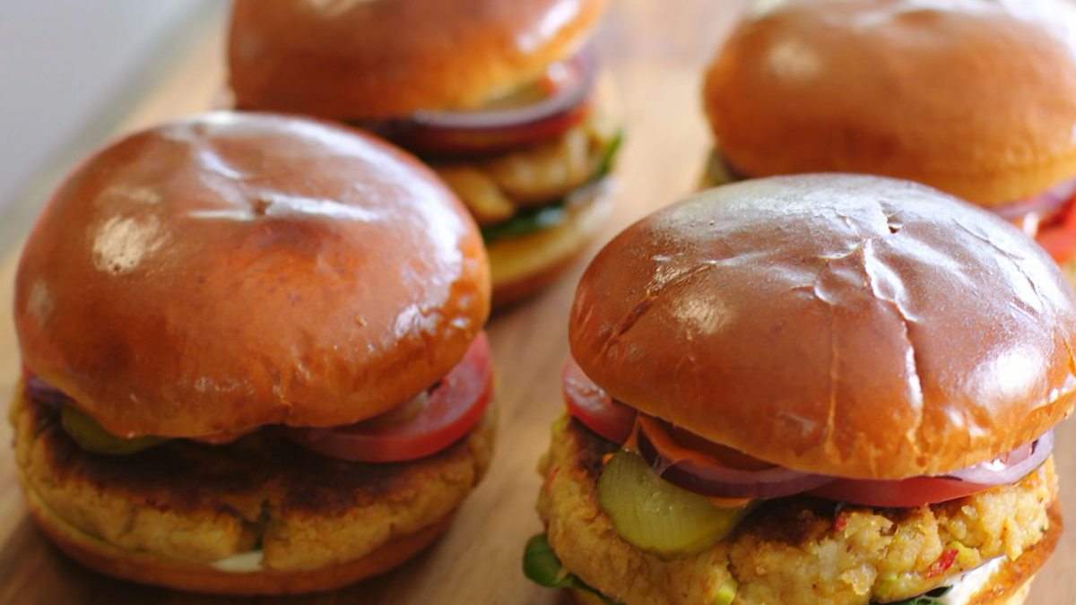 Nadiya transforms leftover mash potato into a mouth-watering cumin aloo burger with bursts of fresh red chilli and spring onion, wedged between a buttery brioche bun.