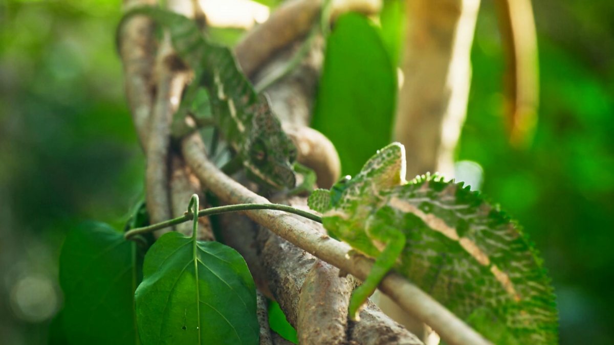In a Madagascan forest, two male chameleons fight for the affections of a female.