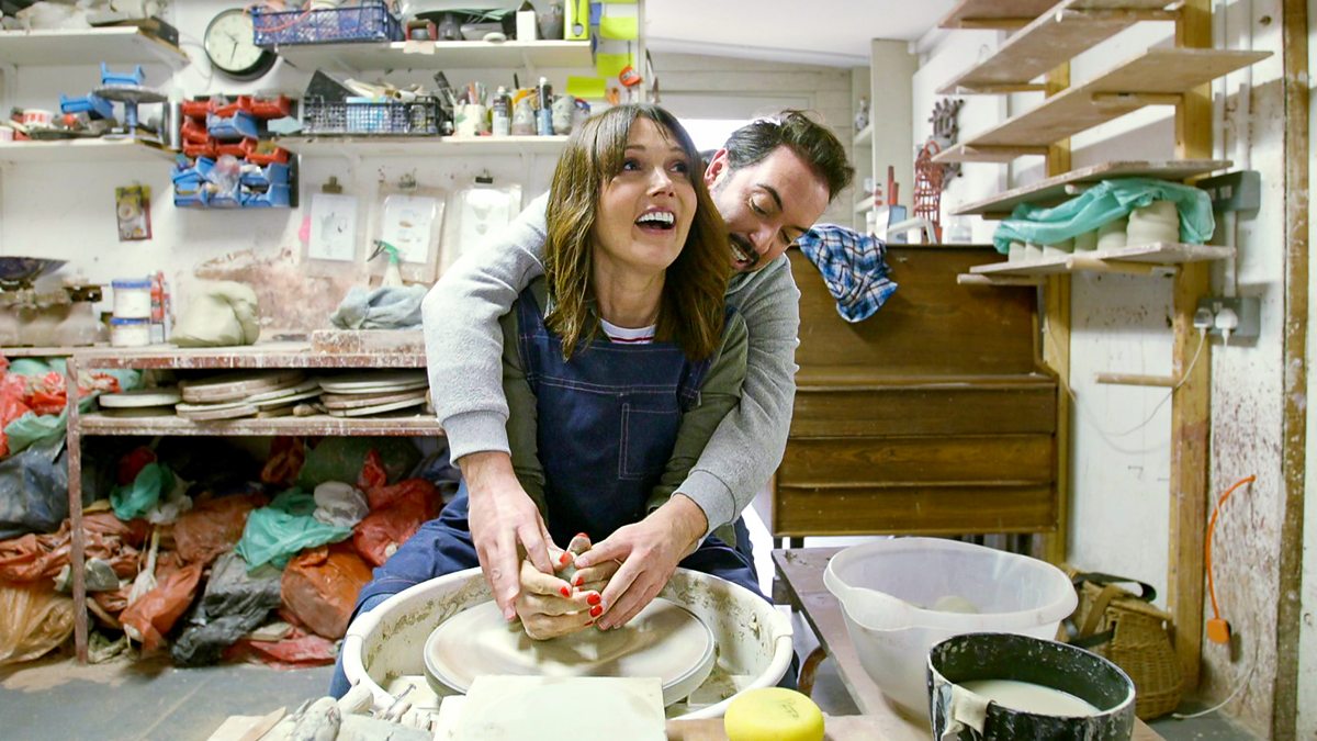 Emma a Trystan sy'n helpu adnewyddu adeilad Clwb Achub Bywyd Poppit gyda help y cynllunydd Gwyn Eiddior. Help renovating the Poppit Sands Life Saving Surf Club clubhouse, with Gwyn Eiddior.