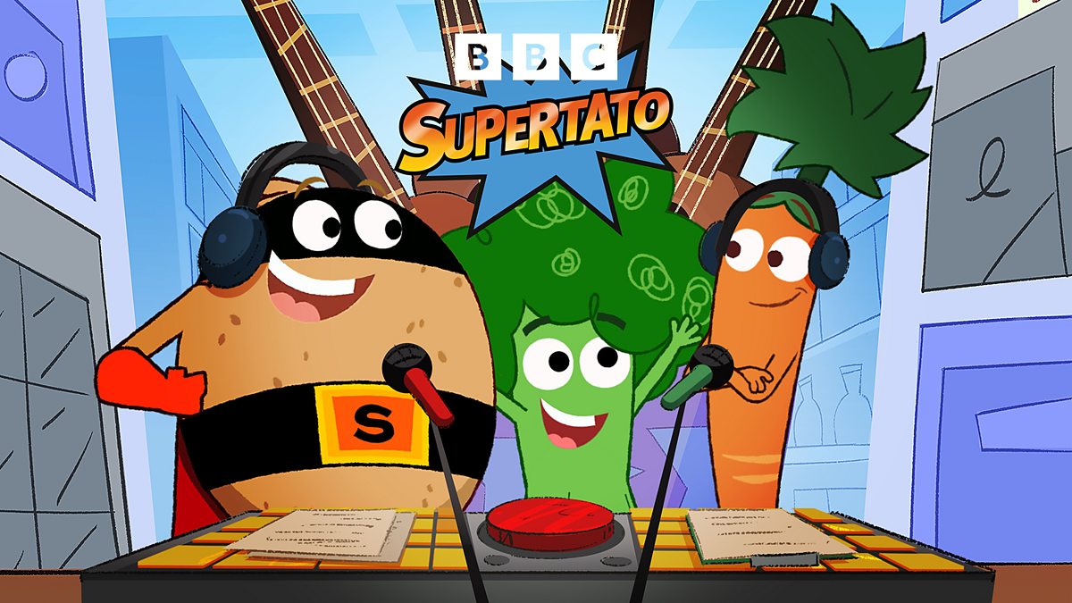 Supertato and his co-host Carrot are joined by their guest Broccoli down in the music aisle who will be teaching the dance craze that’s got the supermarket swinging. But when Evil Pea steals the beatbox and the music stops will it be the end of the Broccoli Boogie on today’s show or will Supertato come to the rescue?