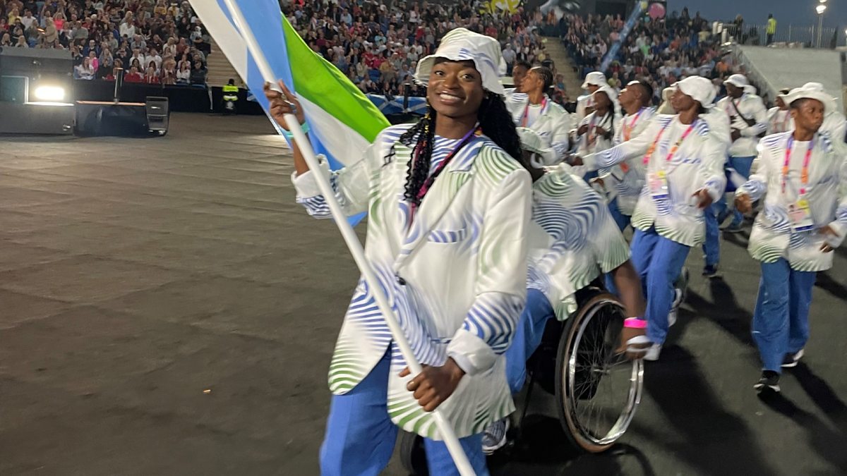 Image: Sierra Leone team captain and flag bearer Hafsatu Kamara holding the Sierra Leone flag at the Opening Ceremony of the 2022 Commonwealth Games in Birmingham. (Image courtesy of Hafsatu Kamara)