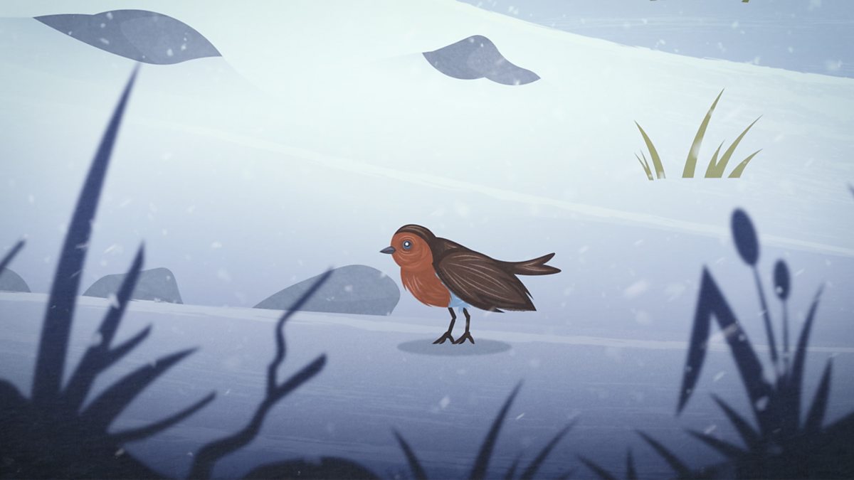 A mother bird works methodically to catch dinner for her young family in the harsh winter.