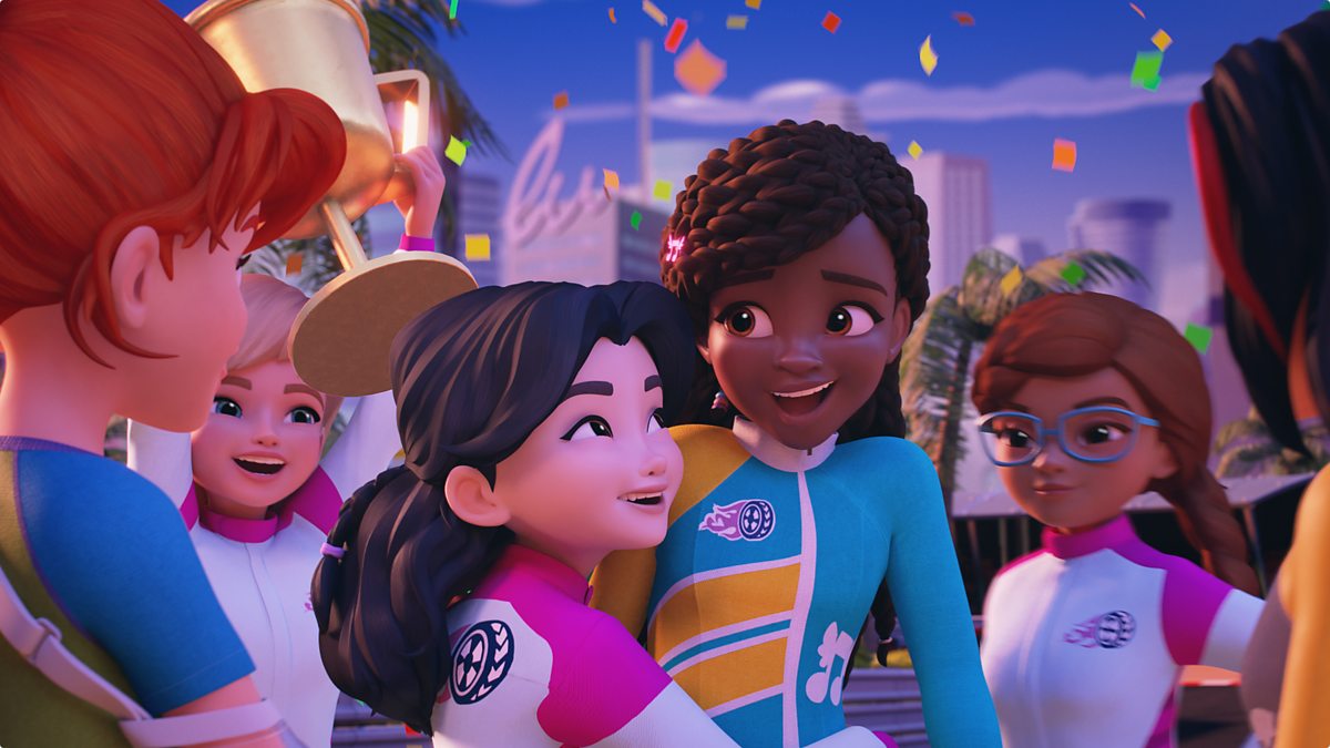 Ymuna Vicky gyda'r tim ond mae rhywbeth yn ei rhwystro i ennill y ras. Yr Alfabots. The girls foil Alvah's plans to win the Grand Prix.