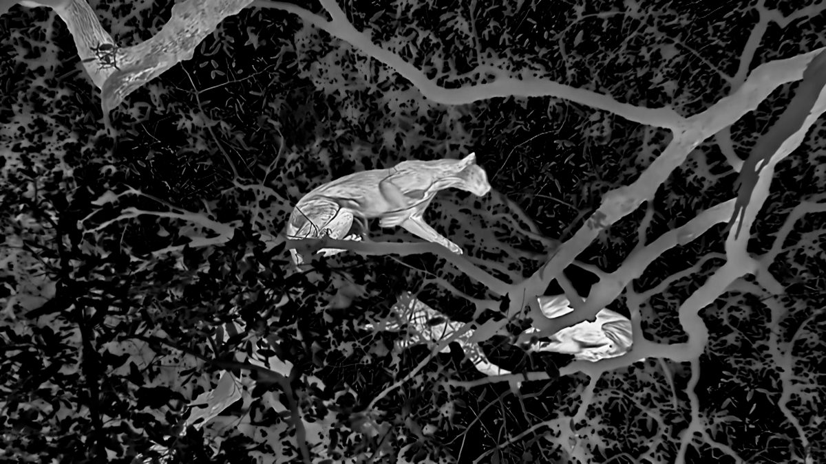 A female leopard hunts baboons twenty metres above the ground in the dead of night.