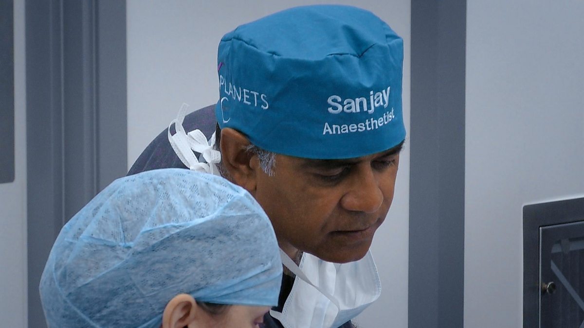 55-year-old Lisa is being operated on to remove tumours that have spread to her liver. The liver holds 13% of the body's blood supply, so to reduce the risk of blood loss, anaesthetist Sanjay has to keep Lisa's hydration as low as possible.