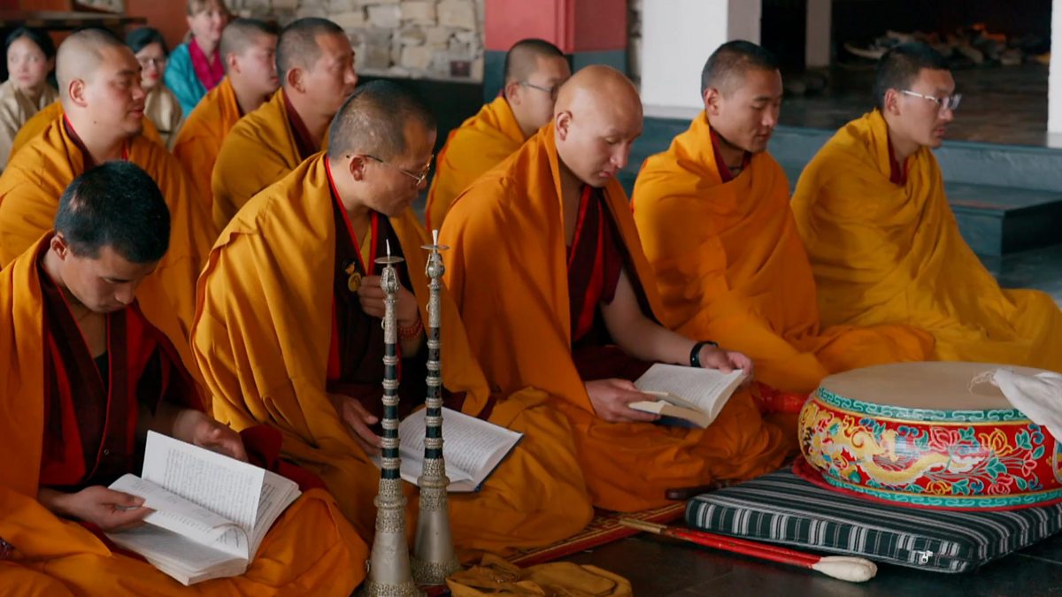 Monica and Rob host local monks for a ceremony at Gangtey Lodge in Bhutan