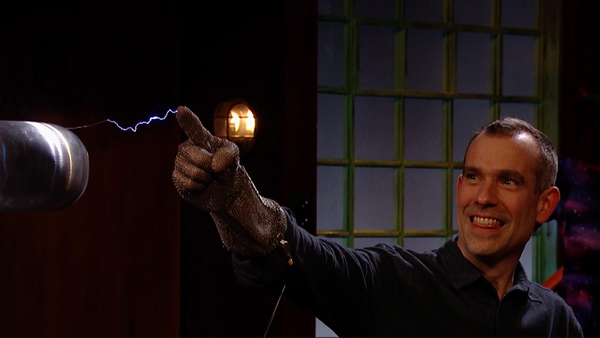 Dr. Chris van Tulleken uses a Tesla coil to show electricity being discharged. He directs the sparks wearing a metal gauntlet.