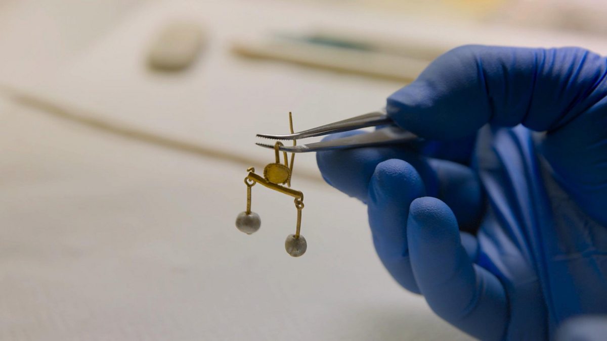 Dr Ludovica Alesse examines a pair of gold and pearl earrings found at the new dig in Pompeii