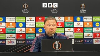 Villa full-back Matty Cash at their pre-match press conference in Bologna.