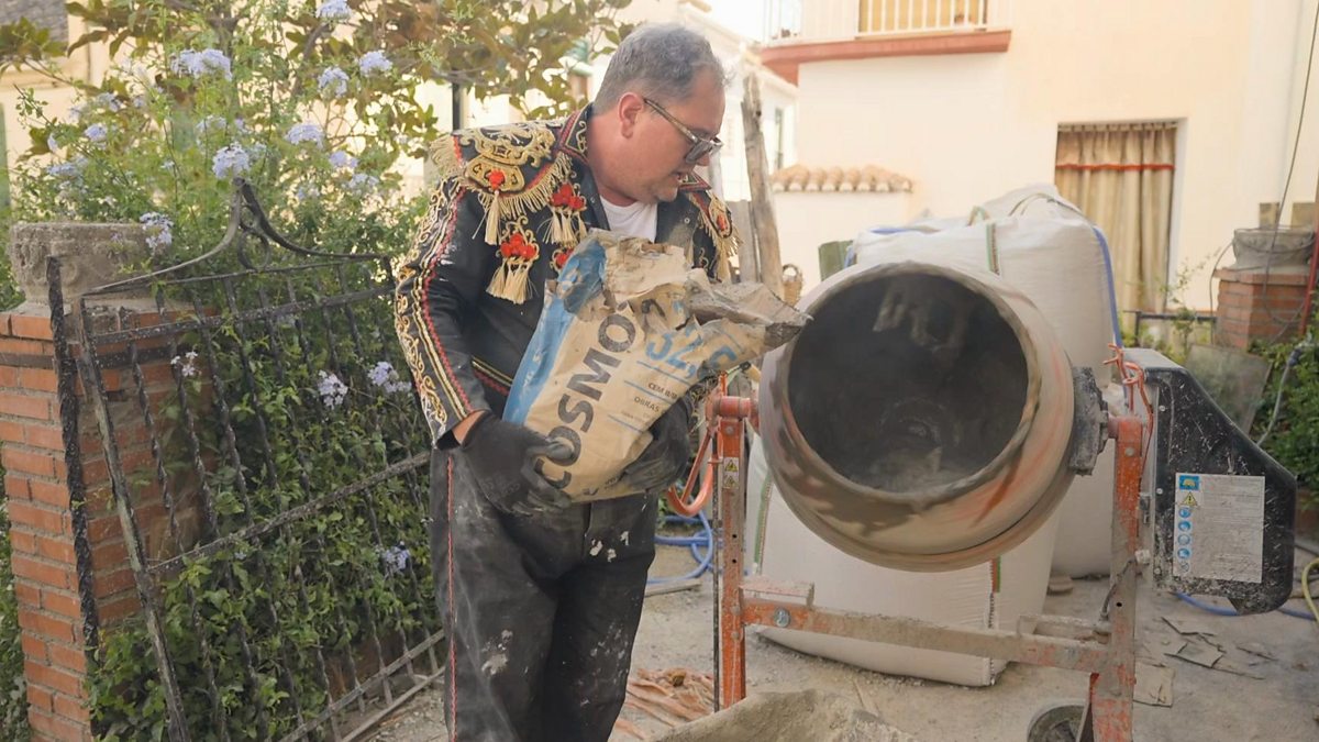 Amanda has a go at rendering…with more ending up on the walls than on the seating!