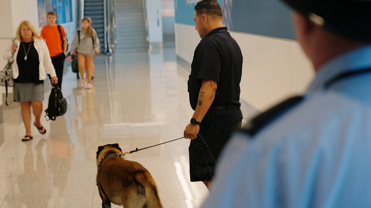 Officer Paul Watson on the work of customs sniffer dog Falco at the international airport.