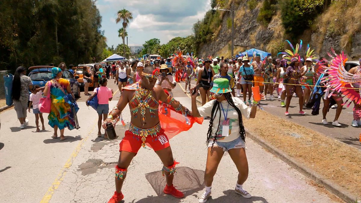 Off duty Officer Chris Douglas partying with locals in a much more colourful outfit at Bermuda’s big annual carnival.