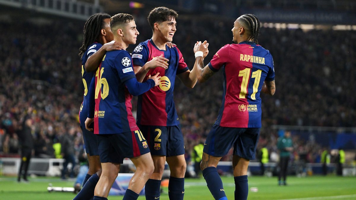 Image: Raphinha of FC Barcelona (R) celebrates scoring his team's first goal with teammates Pau Cubarsi, Fermin Lopez and Jules Kounde during the UEFA Champions League 2024/25 Quarter Final First Leg match between FC Barcelona and Borussia Dortmund at Estadi Olimpic Lluis Companys on April 09, 2025 in Barcelona, Spain. (Photo by David Ramos/Getty Images)