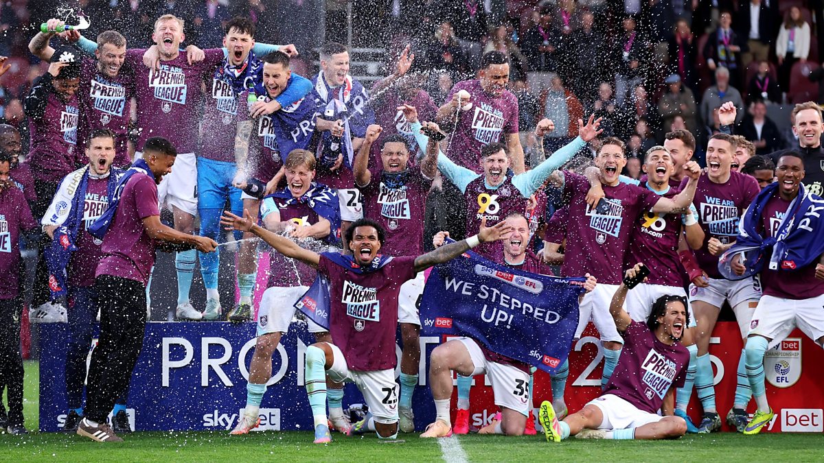 Image: The players of Burnley celebrate with champagne following the team's victory and subsequent promotion to the Premier League in the Sky Bet Championship match between Burnley FC and Sheffield United FC at Turf Moor on April 21, 2025 in Burnley, England. (Photo by Alex Livesey/Getty Images)