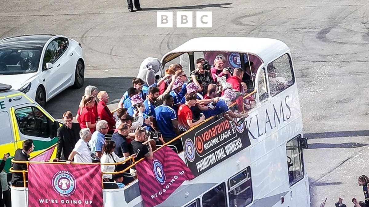 Richard Stead and Ollie Turner talk to Scunthorpe United players and staff at the parade.