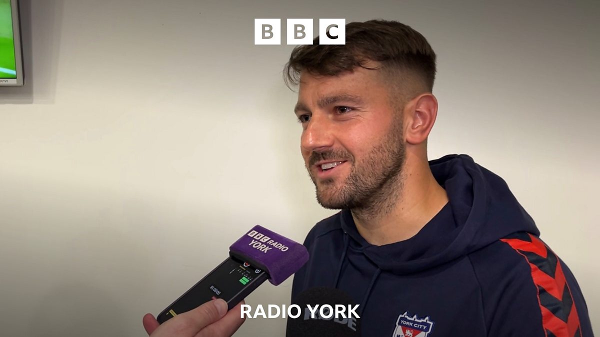 York City striker Ollie Pearce speaking to David Ward, after scoring a brace in their 5-0 win over Carlisle United.