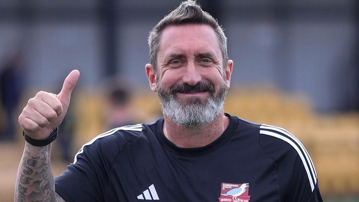 Scarborough Athletic manager Jonathan Greening speaking to James Fletcher after a comfortable 2-0 win over Leamington.