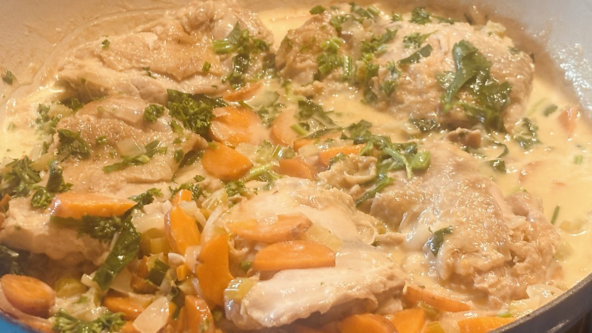 Heat the oil in a large frying pan until smoking hot. Season the chicken with salt and cook for 2 minutes on each side. Remove from pan and set aside. Add the butter to the pan and then add the leeks, carrots, soup celery and onions. Cook for a minute then add the wine. Cook for 2 minutes and add the stock. Return chicken to pan, place a lid on top and simmer for 20 minutes. Add the cream and mustard and simmer for 5 minutes. Add the parsley and check seasoning.