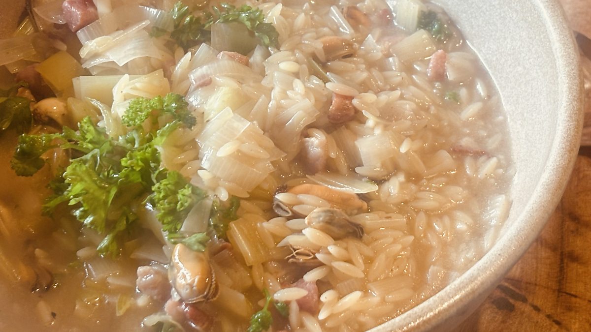 Heat the oil in a pan and add the pancetta. Cook until crispy then add the butter and leeks. Cook for a minute then add the mussel liquor, stock and orzo. Place a lid on top and cook for 12 minutes or until pasta is cooked. Add the mussels and parsley, heat for a minute then serve.