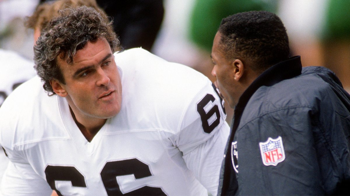 PHOTO: PHILADELPHIA, PA - OCTOBER 22: Steve Wright #66 of the Los Angeles Raiders talks with teammate Bo Jackson during an NFL football game against the Philadelphia Eagles October 22, 1989 at Veterans Stadium in Philadelphia, Pennsylvania. Wright played for the Raiders from 1987-93. (CREDIT: Focus on Sport/Getty Images)
