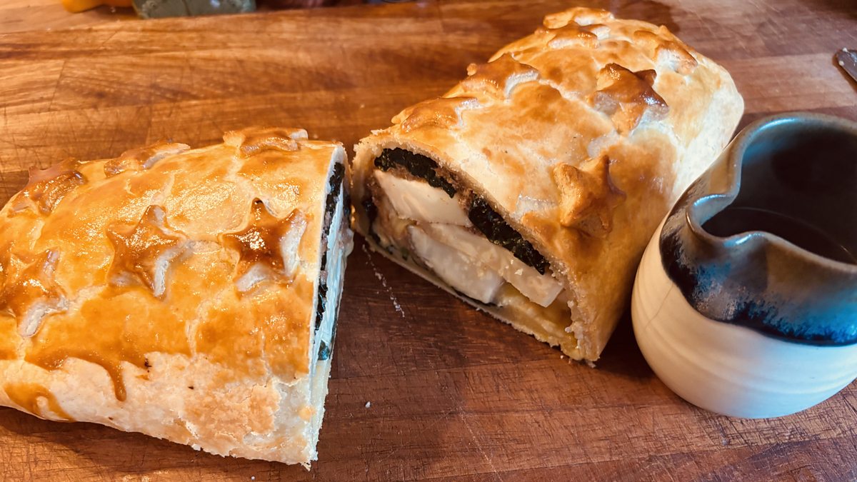 Festive celeriac and mushroom duxelle en croute with peppercorn gravy
