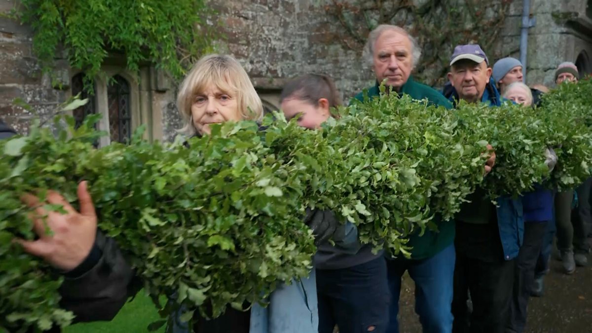 The team at the National Trust's Cotehele create a gigantic 60 foot Christmas garland.