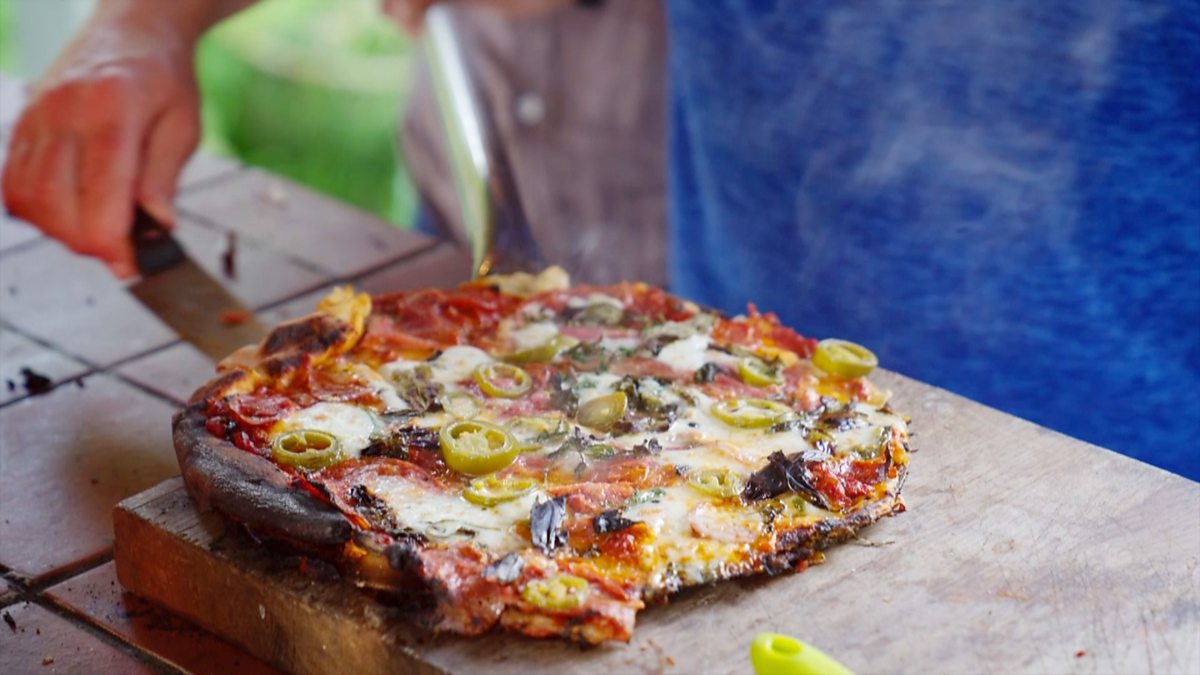 Robson and Rishi's carefully assembled pizza turns into a sort of calzone...