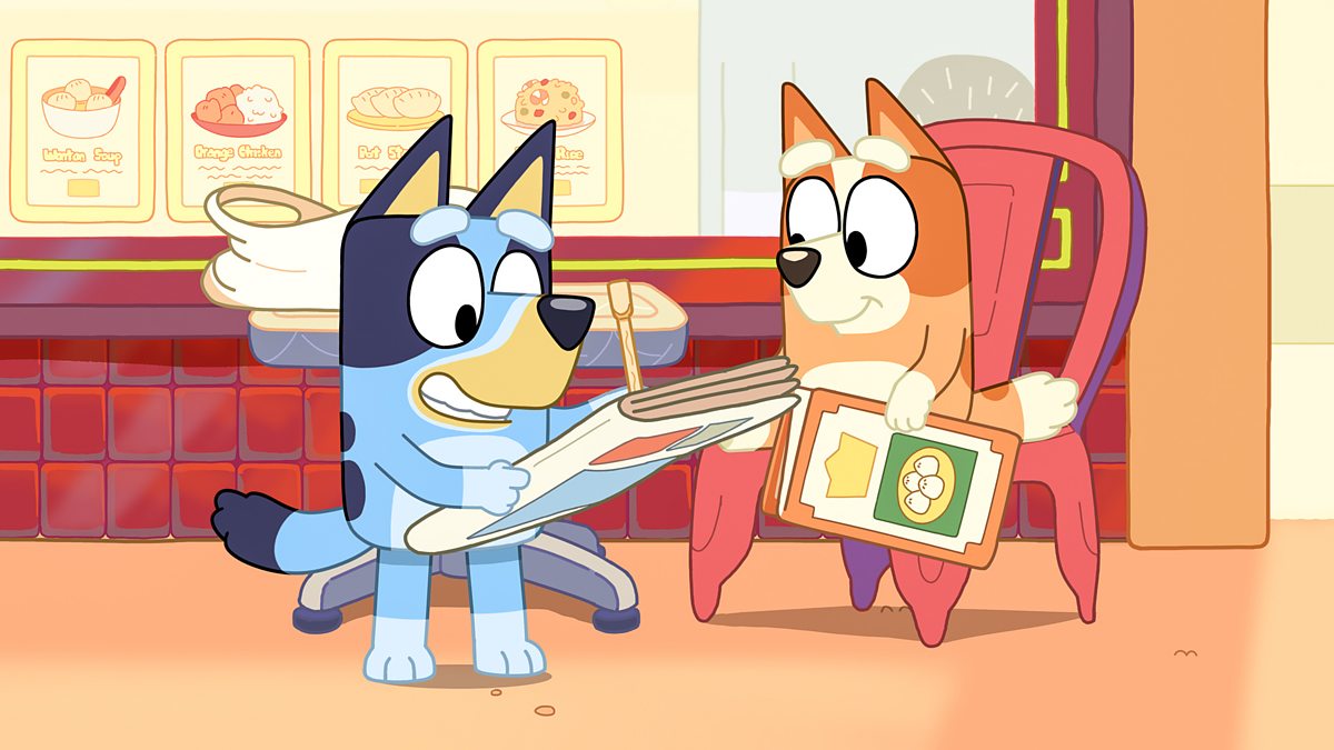 Mae Dad yn mynnu aros pum munud arall am tec-awe ond mae Blwi a Bingo yn aflonydd iawn. Dad insists on waiting five more mins for a takeaway but Blwi and Bingo become restless.