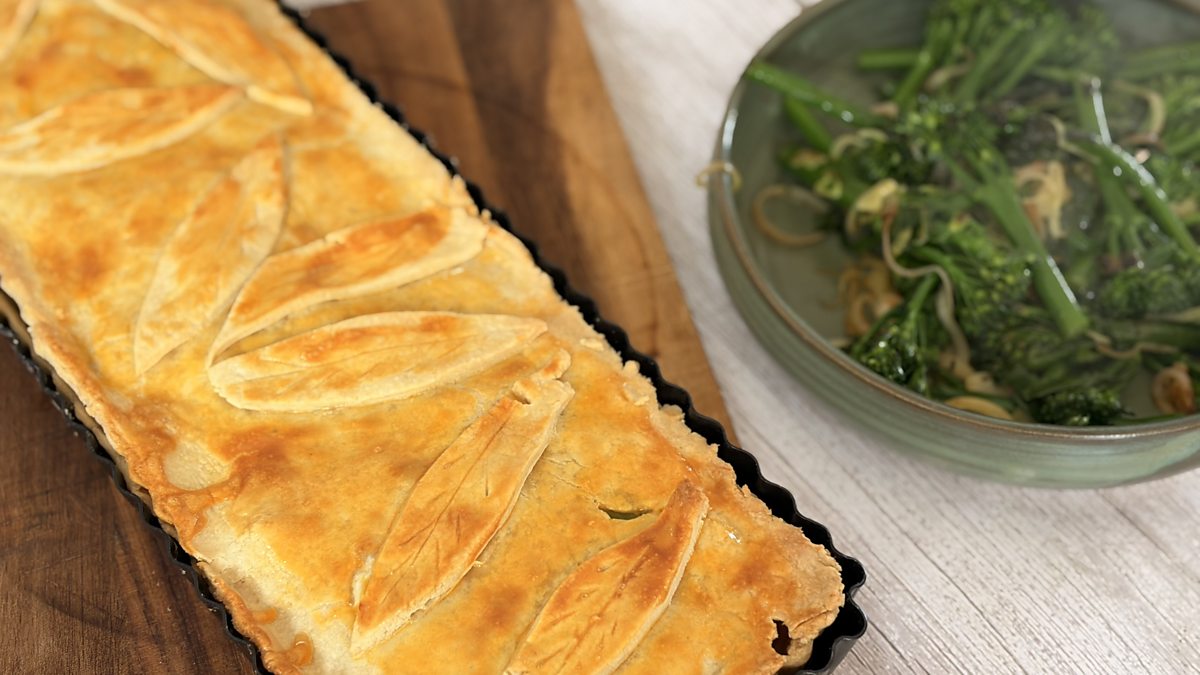 Line with foil and fill with baking beans. Chill for an hour then bake in a 180oc oven for 12 minutes. Remove beans and foil and bake for another 5 minutes. Fill with the chicken mixture. Roll out the remaining pastry and cover the chicken mixture. Crimp the edges and brush with egg yolk. Roll out the ends of pastry and make leaves. Place on pie and cover with more egg yolk. Bake in a 180oc oven for 30 minutes.