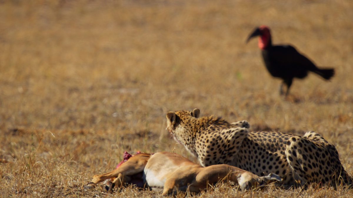 Cheetah Neelo has to eat quickly before the circling vultures bring lions to her meal