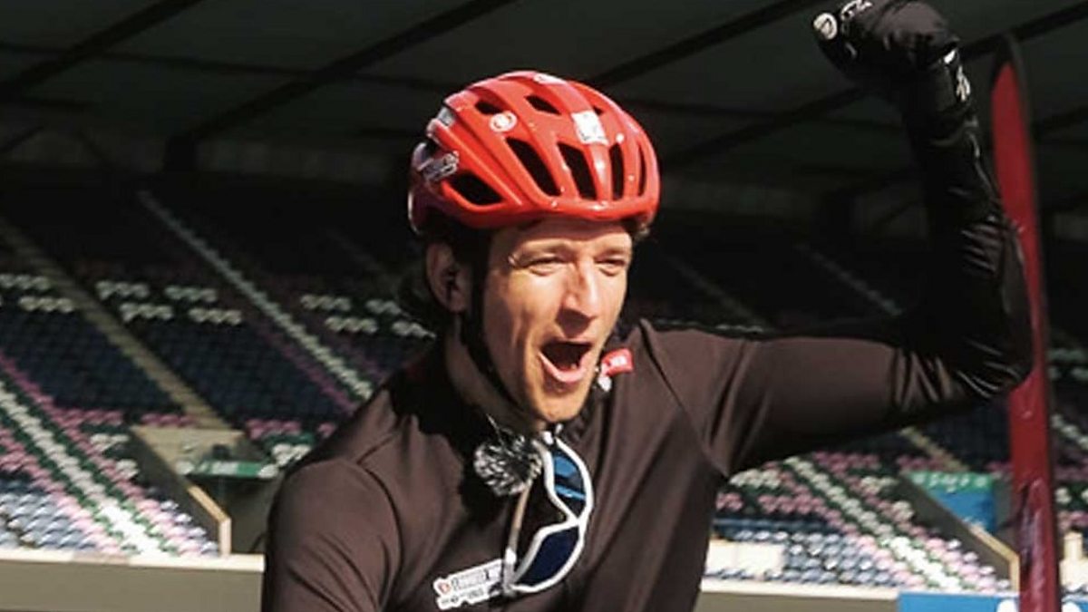 Greg James crosses the finish line in Edinburgh