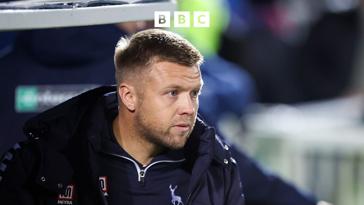 Hartlepool United manager Nicky Featherstone talks to Rob Law after victory at Morecambe.