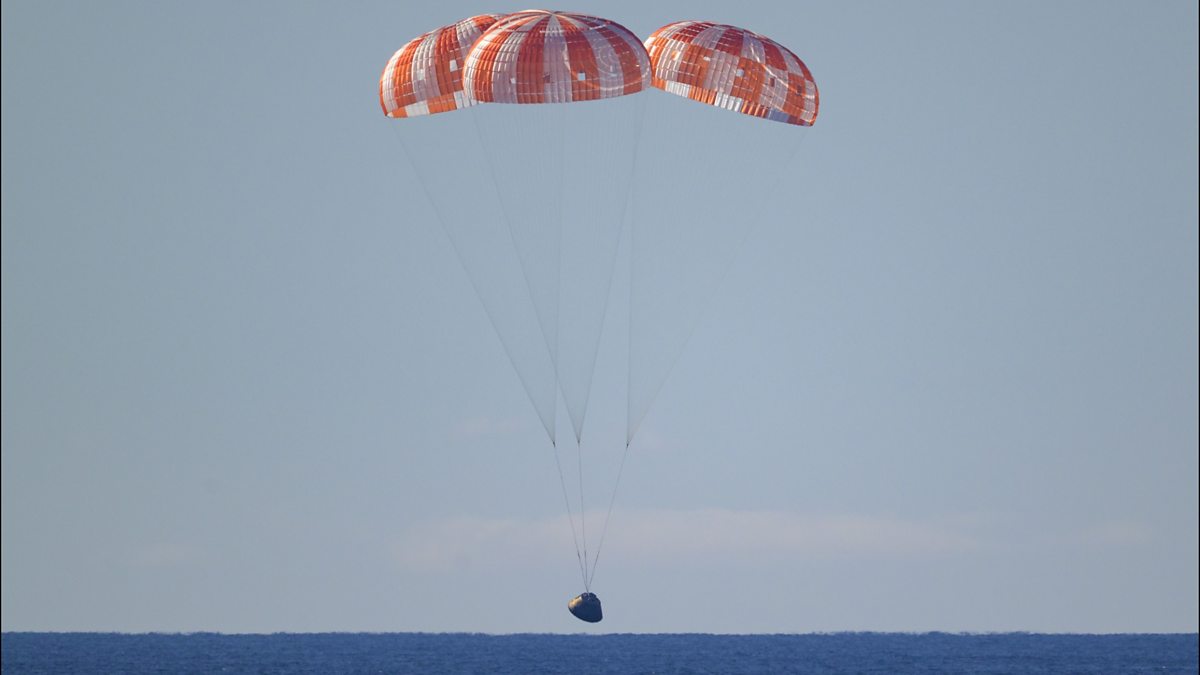 Nasa's four Artemis astronauts: commander Reid Wiseman, pilot Victor Glover, mission specialist Christina Koch and Canadian astronaut Jeremy Hansen have safely returned to Earth, after a nine-day mission around the Moon. Officials say the crew are "feeling great" and will now undergo full medical checks. The Orion module carrying the team back to Earth splashed down in the Pacific Ocean on schedule after a six-minute communications blackout. Nasa officials say teams in the Houston control room monitoring the crew's re-entry were elated and that the mission exceeded expectations, describing it as a "gift to the world".