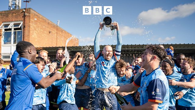 Beverley Town FC have been promoted! James Hoggarth celebrates the club's achievement with captain James Piercy and vice-chair Richard Jagger.