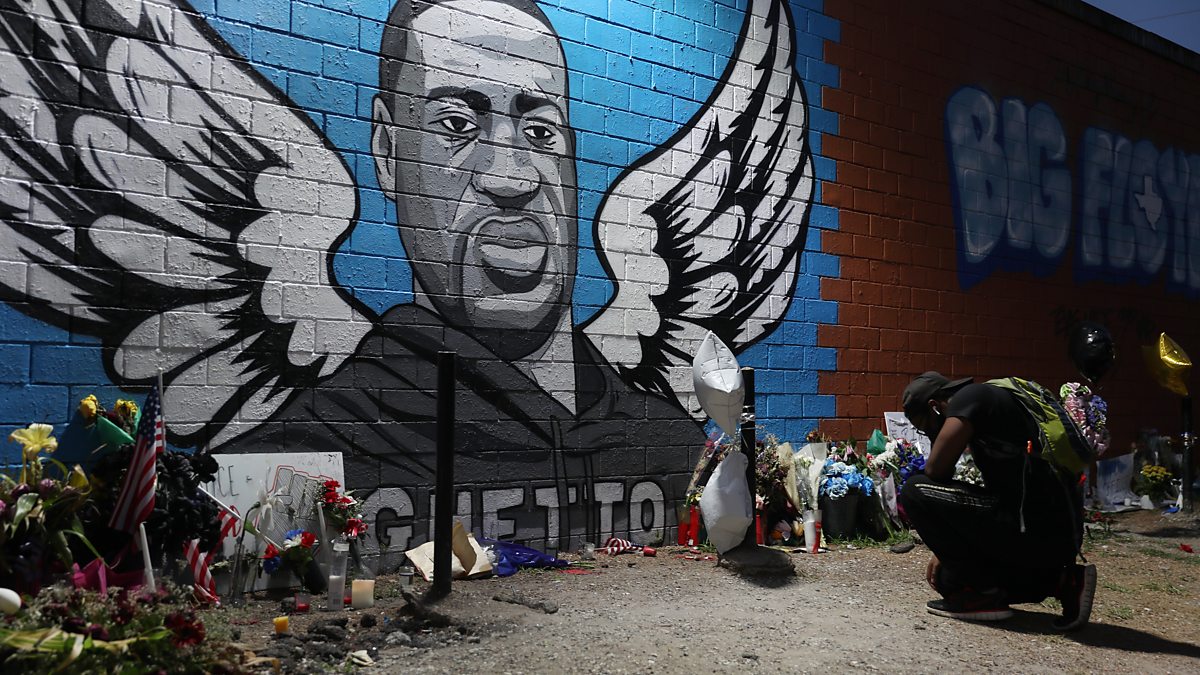 (Photo: A man kneels in front of a memorial and mural that honours George Floyd at the Scott Food Mart corner store in Houston"s Third Ward. Credit: Joe Raedle/Getty Images)