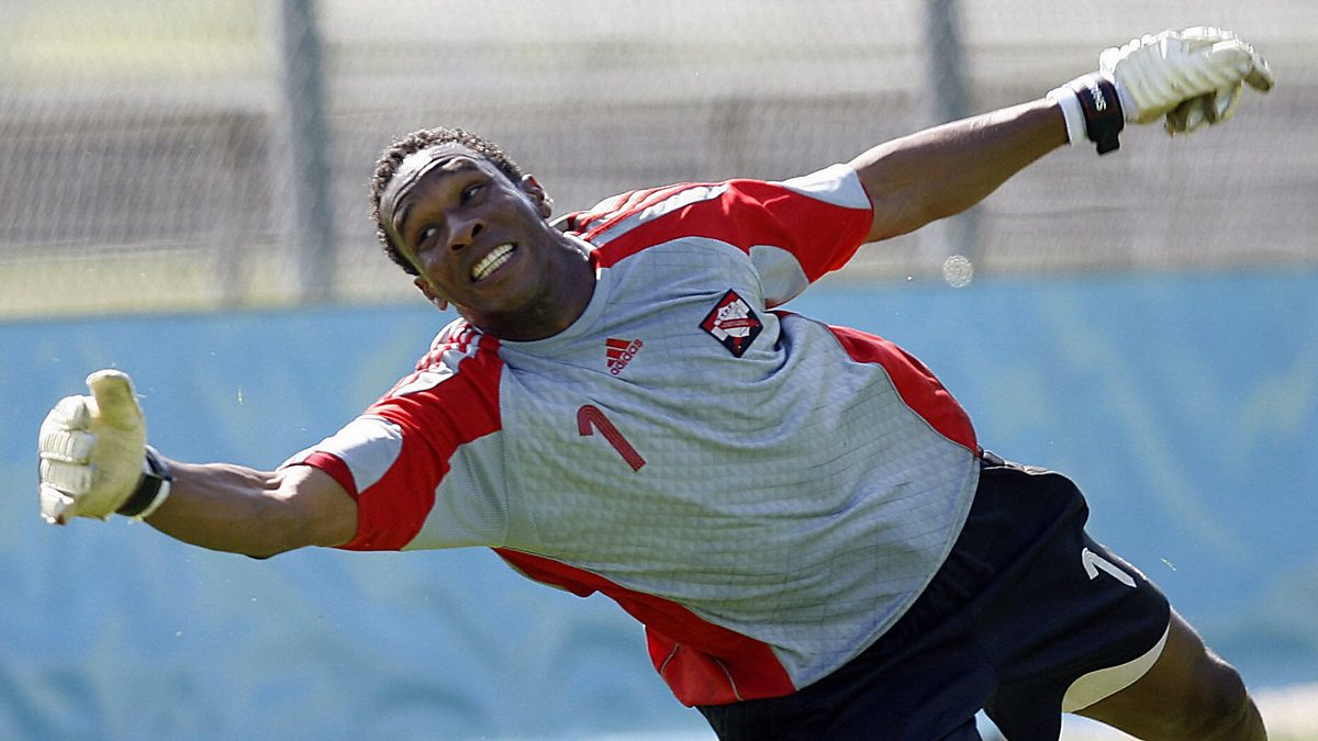 Photo: Trinidad and Tobago's goalkeeper Shaka Hislop dives for the ball during a training session at " In der Ahe " stadium in Rotenburg, northern Germany, 18 June 2006. Trinidad & Tobago will face Paraguay on 20 of June for their last game in the first round of group B for the 2006 Fifa World Cup. AFP PHOTO / ARIS MESSINIS (Photo credit should read ARIS MESSINIS/AFP via Getty Images)