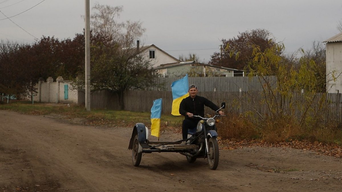 (Photo: Teacher Yurii Nevolchuk rides a motorcycle with national flags in the village of Blahodatne, retaken by the Ukrainian Armed Forces a day ago, amid Russia's attack on Ukraine, in Kherson region, Ukraine November 11, 2022. Credit: Valentyn Ogirenko/Reuters)