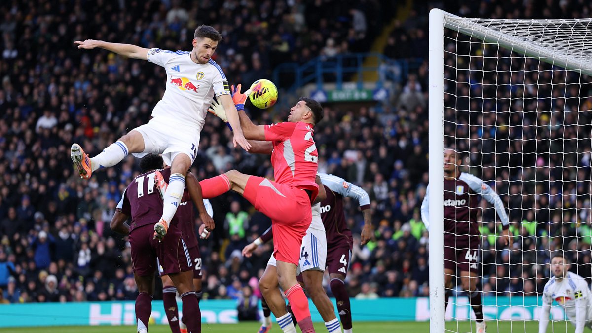 Photo: Anton Stach of Leeds United battles for possession with Emiliano Martinez of Aston Villa before Lukas Nmecha of Leeds United scores his team's first goal during the Premier League match between Leeds United and Aston Villa at Elland Road on November 23, 2025 in Leeds, England. (Credit: Getty Images)
