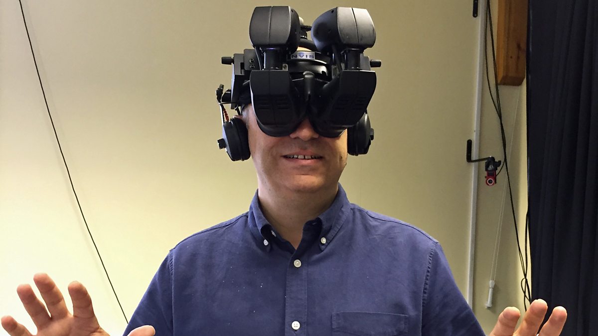 (Image: Adam Shaw testing virtual reality equipment. Credit: BBC)