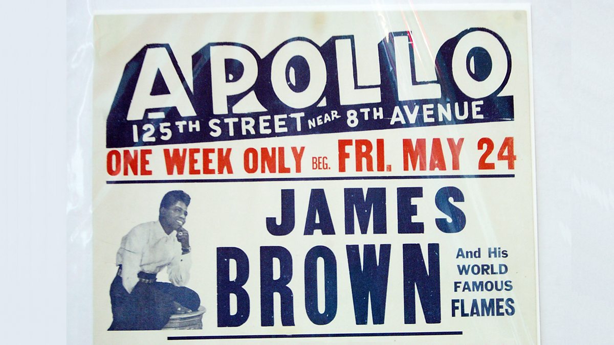 (Photo: A James Brown concert poster from the Apollo Theater is seen at an auction preview . Credit: Getty Images)
