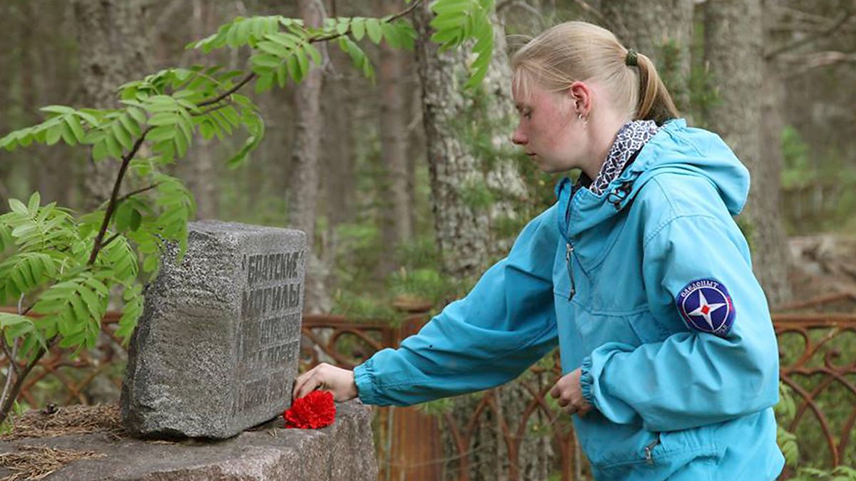 (Photo: Marina Titova places flowers on a plaque commemorating her relative who was shot trying to escape from the Mudyug camp. Credit: Alexey Sukhanovsky)