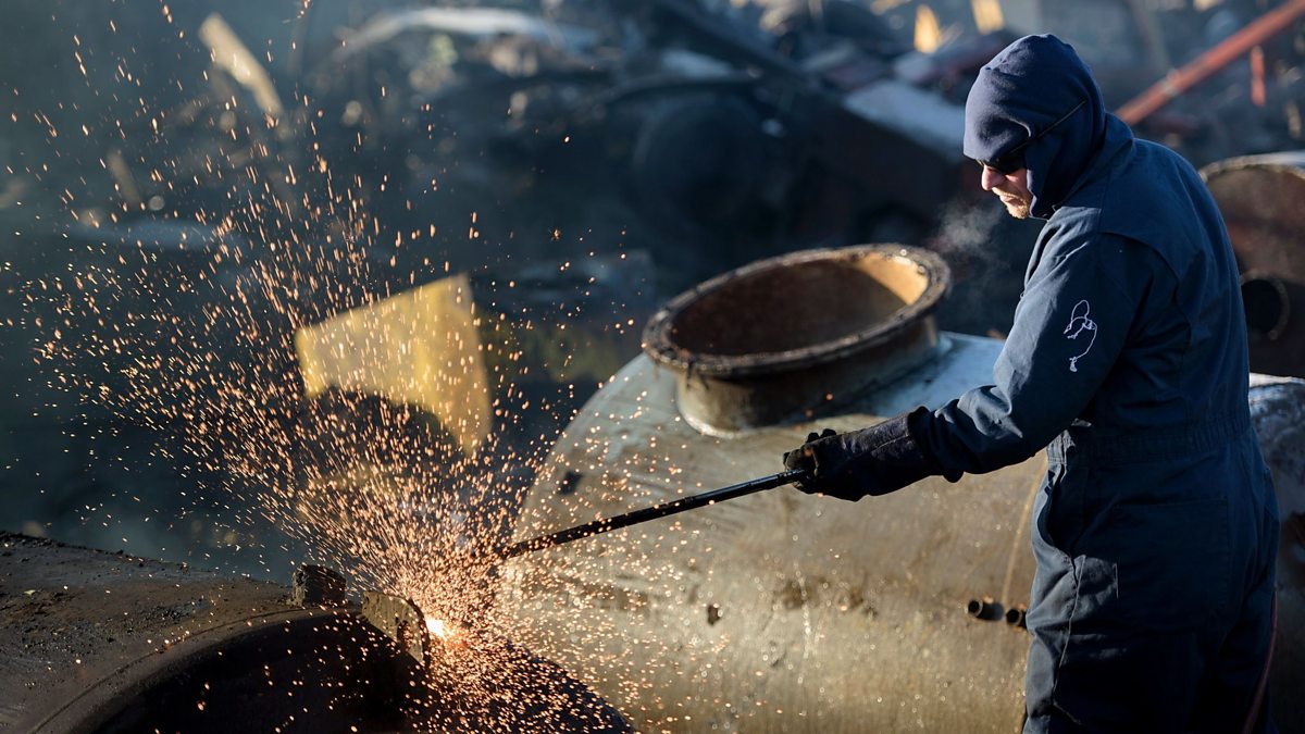 (Picture: A worker breaks down a metal tank at a scrap metal yard in Cleveland, Ohio; Credit: Brendan Smialowski/AFP/Getty Images)