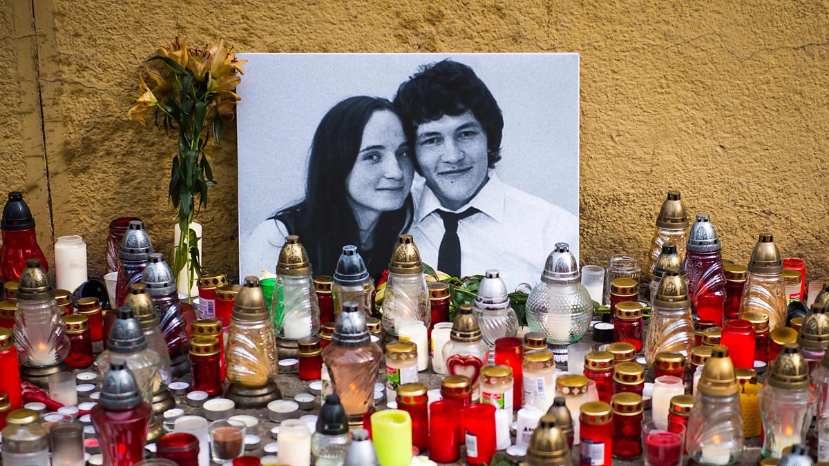 (Image: Candles placed in front of a portrait of investigative reporter Jan Kuciak and his girlfriend Martina Kusnirova. Credit:AFP/Getty Images)