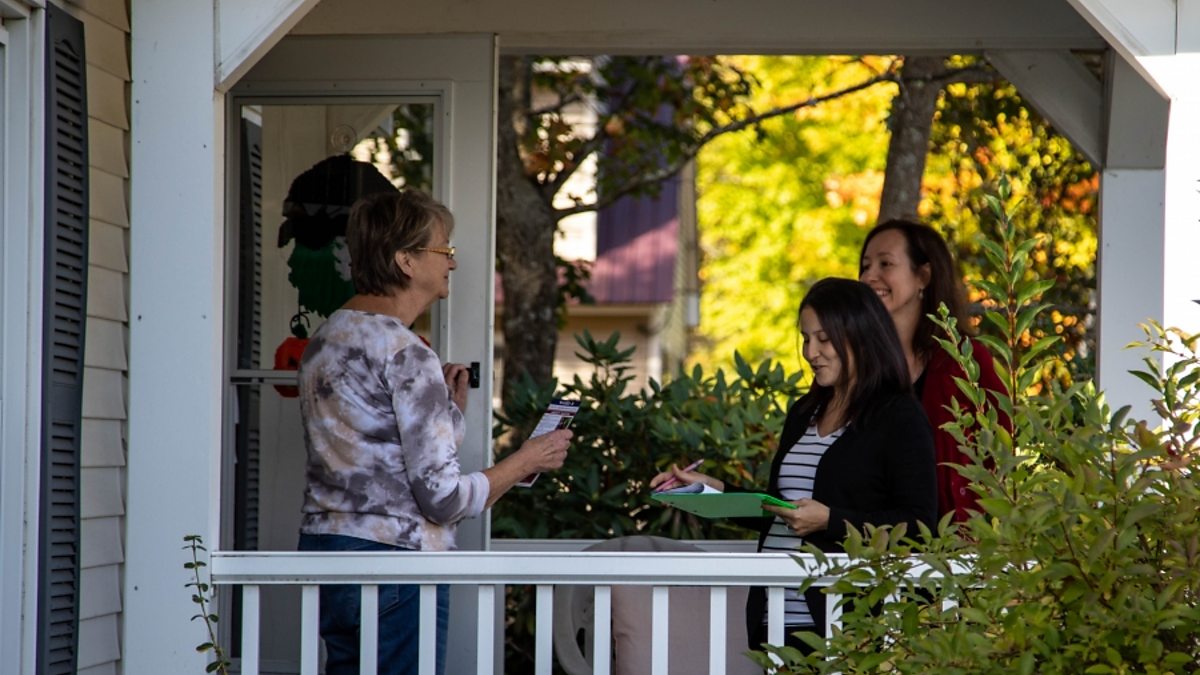 (Safiya Wazir speaks with a resident of Concord, New Hampshire, during her campaign in a race for the New Hampshire House of Representatives. Credit: Steven Davy/The World)