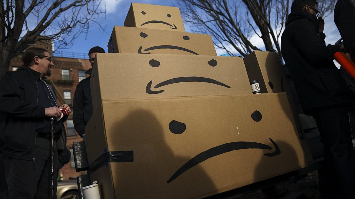 (Picture: Boxes with the Amazon logo turned into a frown face are stacked up after a protest against Amazon in Long Island City; Credit: Drew Angerer/Getty Images)