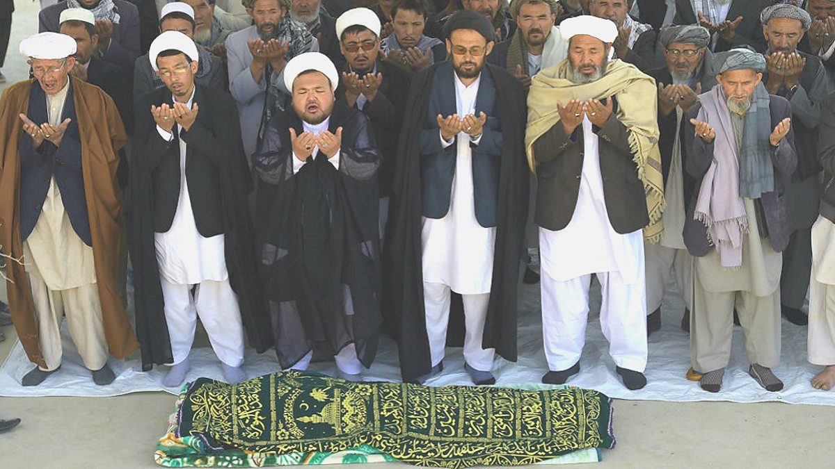 Photo: Mourners and relatives pray in front of the coffin of one of the victims of a bomb set off in a voter registration centre in Kabul, on April 23, 2018. (SHAH MARAI/AFP/Getty Images)