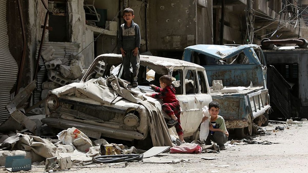 Photo: Syrian boys play on a destroyed car in the former rebel-held Syrian town of Douma on the outskirts of Damascus on April 19, 2018 (STRINGER/AFP/Getty Images)