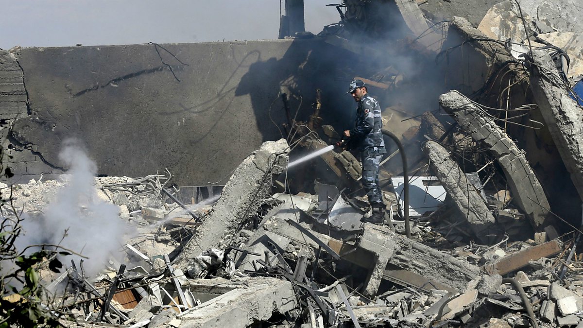 A Syrian soldier sprays water on the wreckage of a building described as part of the Scientific Studies and Research Centre compound north of Damascus, following airstrikes by United States, French and British forces, April 2018