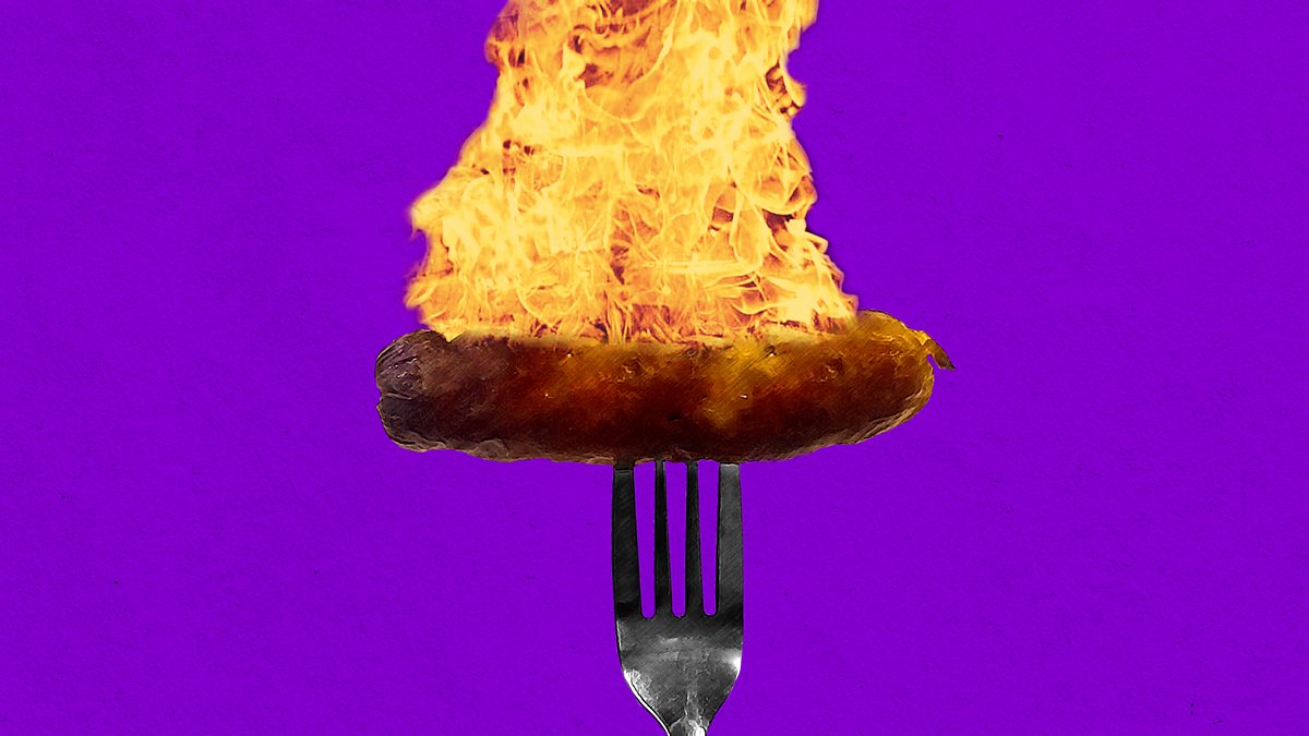 (Picture: Sausage on fork, Credit: BBC)